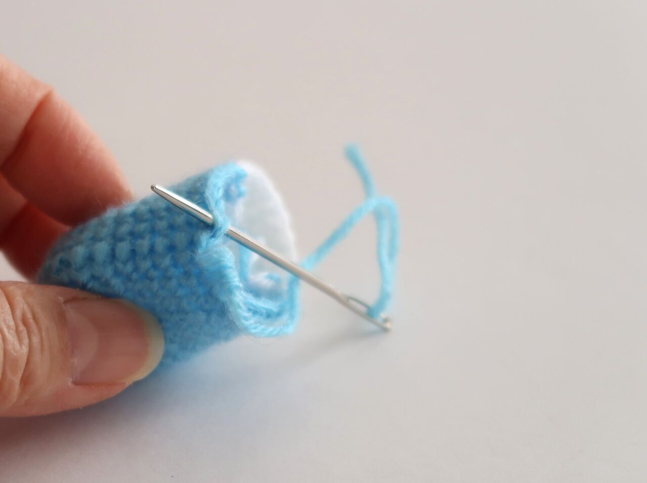 中細用の針に糸を通して、針を細編みの足から細編みの頭の鎖編みに通します。