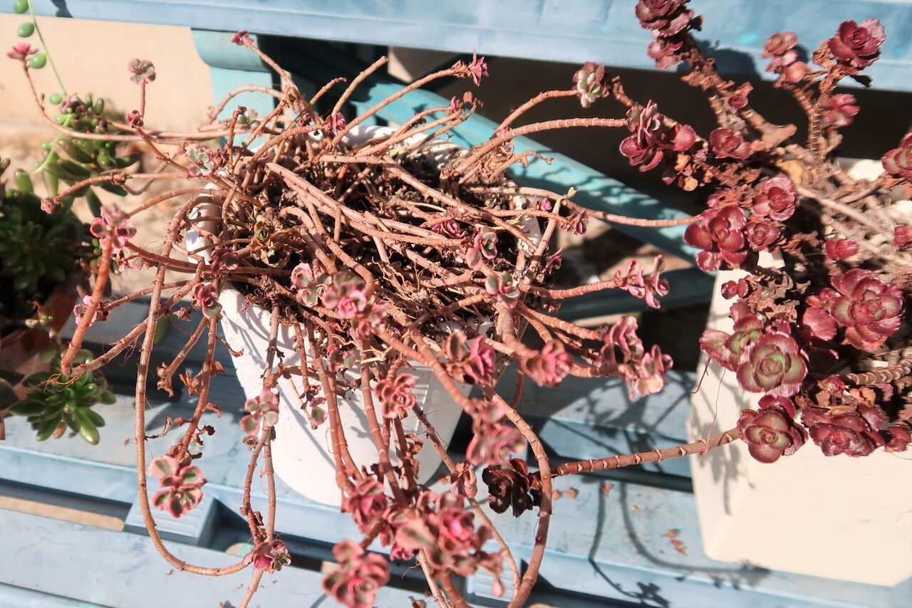 水不足と根詰まりが原因だと思われます。その上、逆さにひっくり返してしまいました。葉っぱが無くなっていたのでたくさん枝を折ってしまいました。あちこちの鉢にさしてあります。