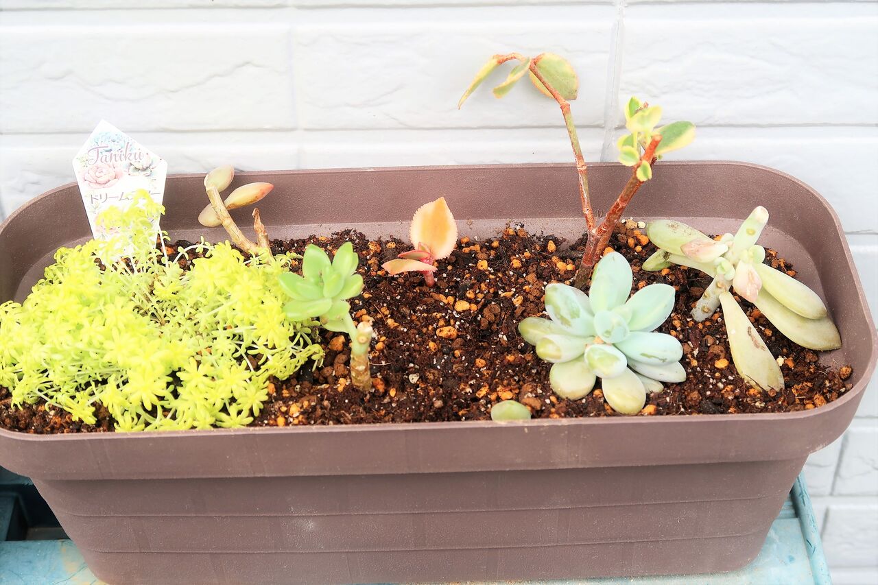 4月21日、多肉をかき集めて植え付けたときの姿。大きくなる姿は想像できず、とりあえず感がいっぱいの鉢です。