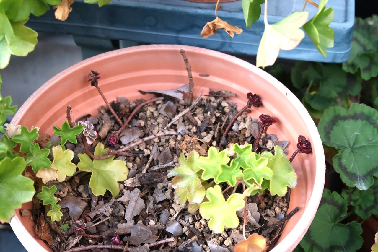 マンネングサのさし木をされたゼラニウムの鉢。