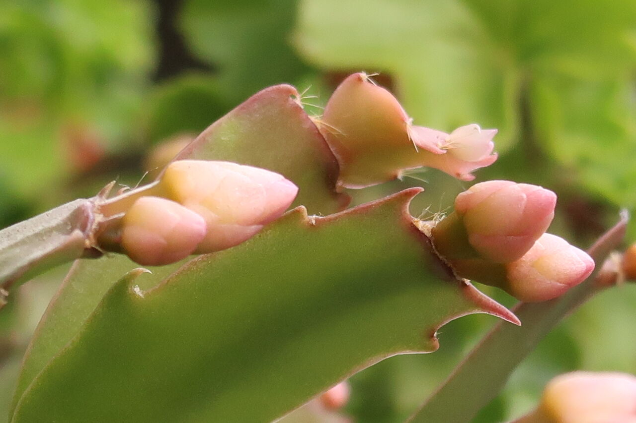 充実していない葉には小さな蕾がありましたが、来年のために咲かせません。しかしこんなにきれいなシャコバサボテンの葉を、この時期見たのは初めてです。買った親株(上)も手に入れたときは処分品の中の一つで、かなり弱っていましたから。