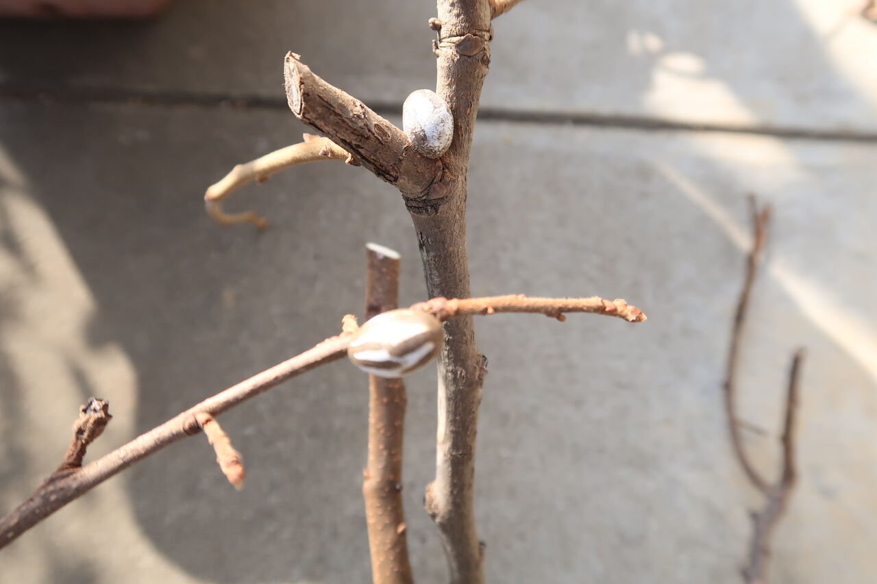 毛虫の卵やサナギがないか点検する(イガラのサナギは枝と同じ色になって見つけにくくなっています)