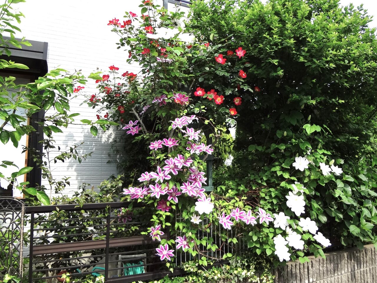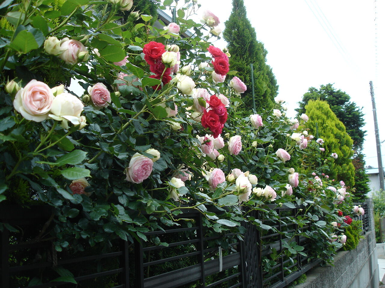 ツルバラは誘引作業があります。厳しく考えず、咲かせたいところに枝を持ってくる様にするといいです。シュートはなるべく水平にすると水平になった部分の芽から花をつけます。
