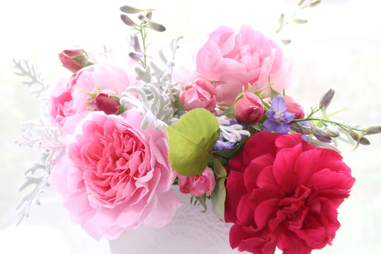 イングリッシュローズは120センチから180センチで枝がアーチ状になるものが多く、剪定は80センチくらいのところでいい芽の上で切ります。