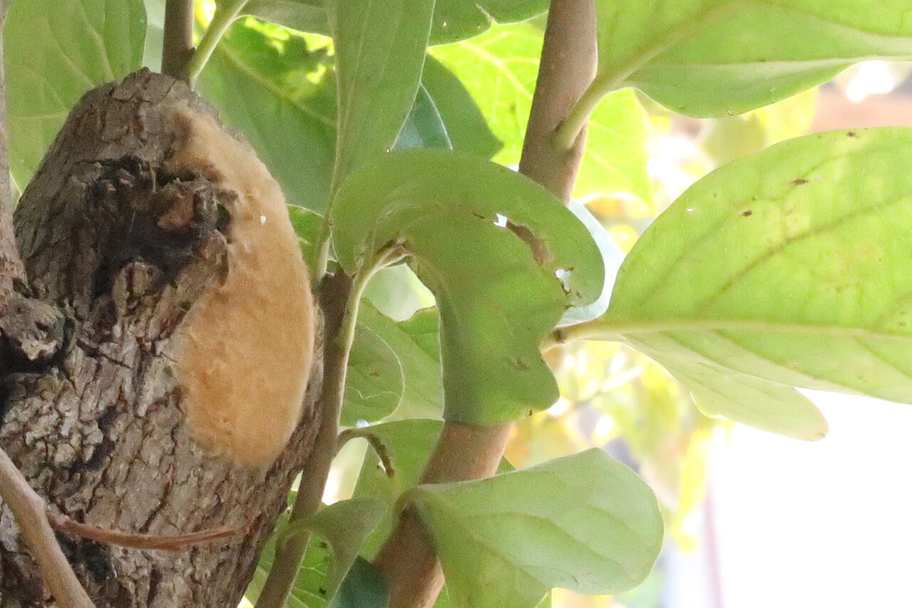 マイマイガの卵、ツルバラの高いところに産卵されることがあります。