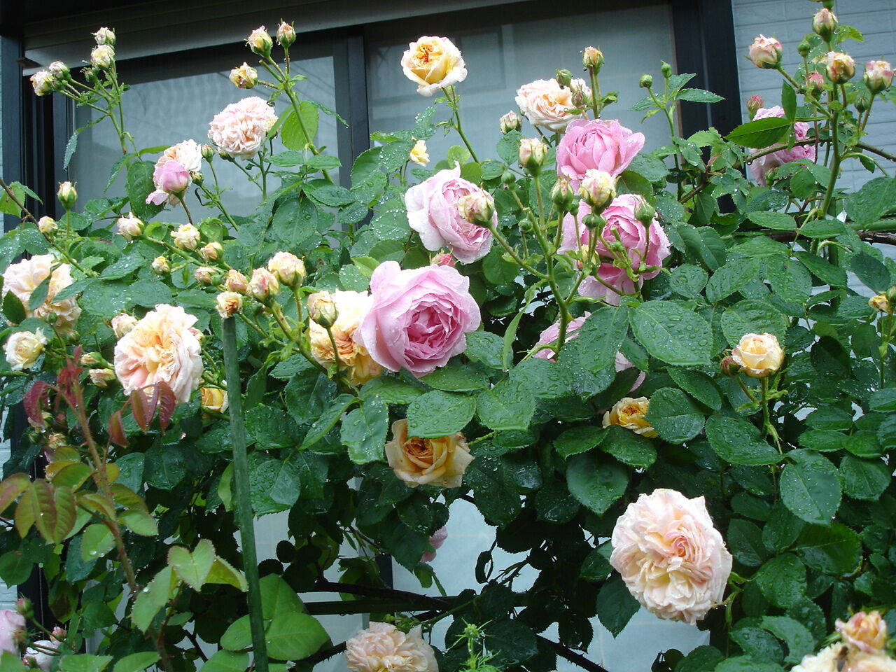 イングリッシュローズ・コンスタンススプライ。3メートルくらい枝を伸ばします。短く剪定してHTローズのように咲かせても、このように誘引してつるバラのようにも咲かせることができます。一期咲き。