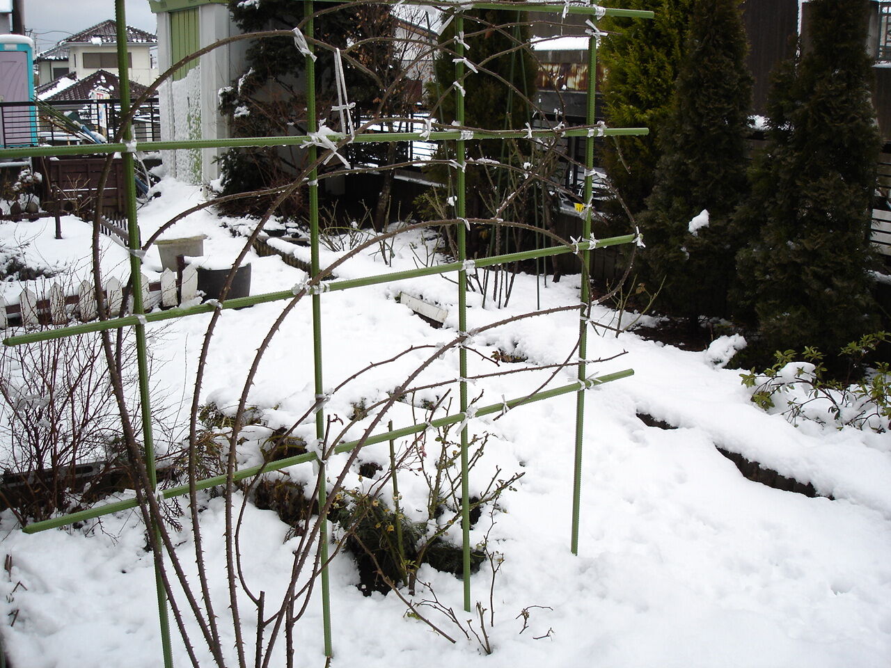 2005年2月25日、1月に剪定した後暖かい日が続いて芽が伸び出した頃に雪が降りました。幸い伸び出した芽は傷んでいませんでしたが、用心して長めに切って2月終わりごろに再度ハサミを入れています。