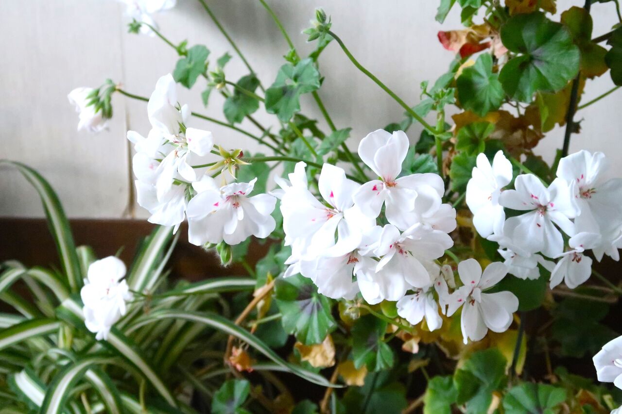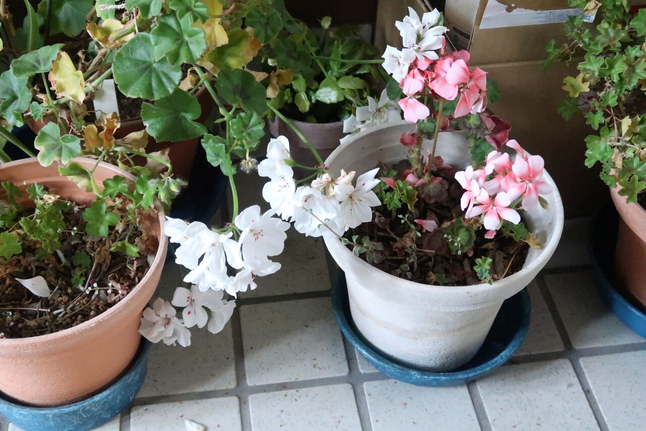 寒いので家の中に入れたアイビーゼラニューム、これがものすごく咲いて、肥料も水もやっていなかったので花がら切ったほうがいい・・・と言いつつ咲かせています。