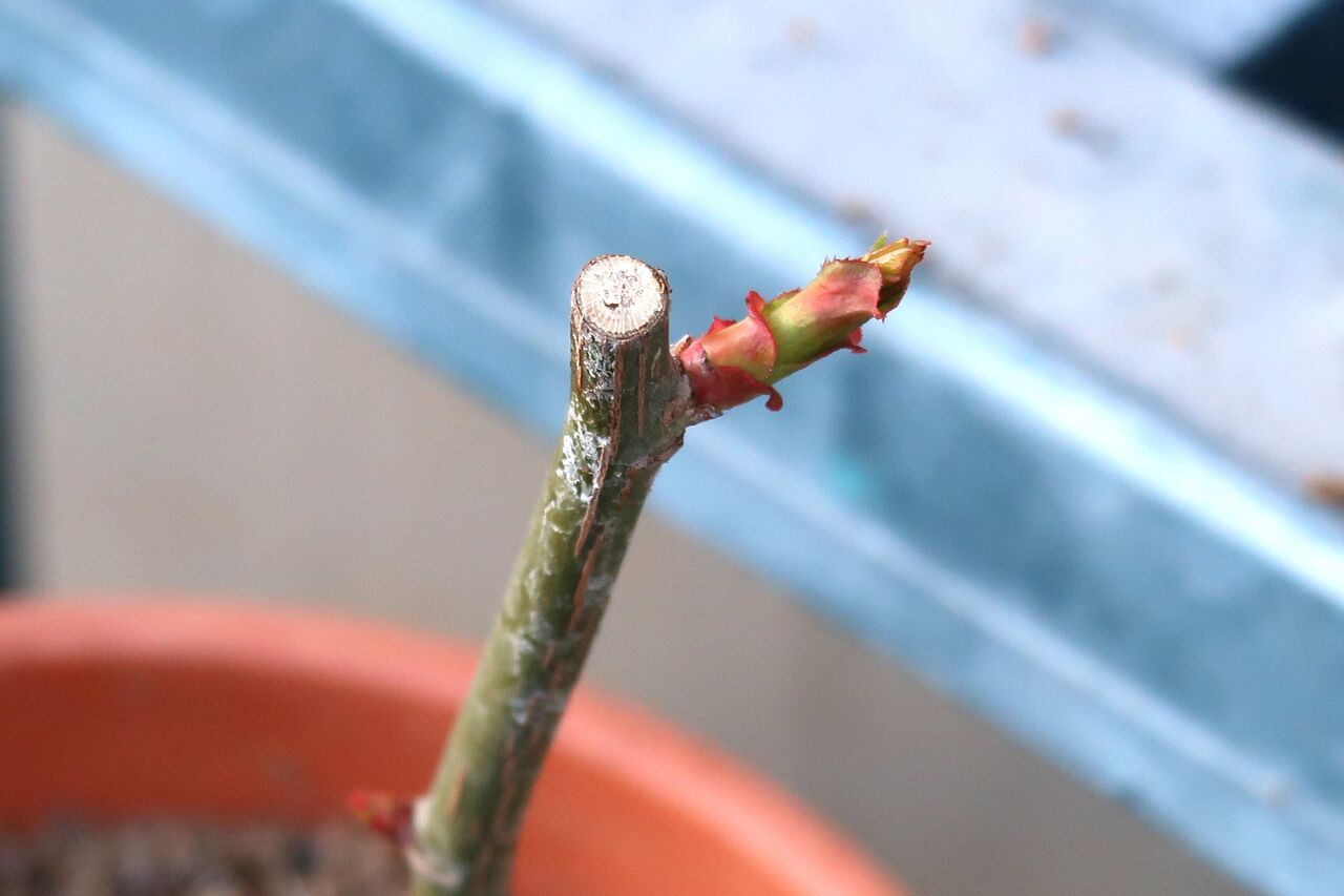 休養中のその間に暖かい日が続いて剪定したところから芽が伸びてしまいました。これから植替えをするというのに3月並みの芽の伸び方です。