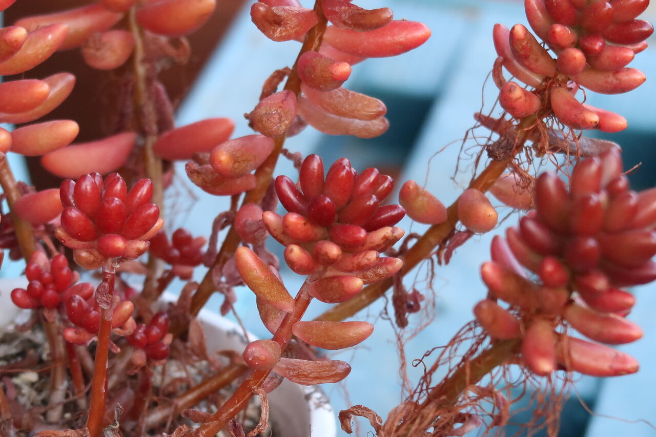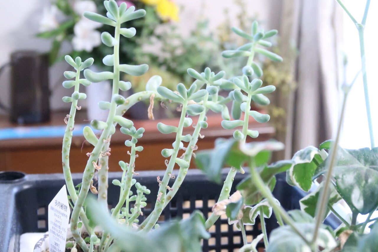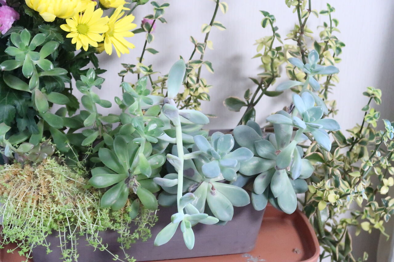 寒さに弱い多肉が多く家の中に取り込みました。窓際に置きたいのはやまやまですが狭い家の事情でそういうわけにもいかず、もやしっ子になっています。