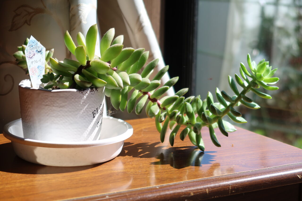 オウレイ は葉が落ちず、部屋に入れても変化ありません。少しずつ伸びています。子株が脇から出ています。手間いらずの多肉です。外では葉の色が悪くなったので最低気温が+5度を目安に入れました。