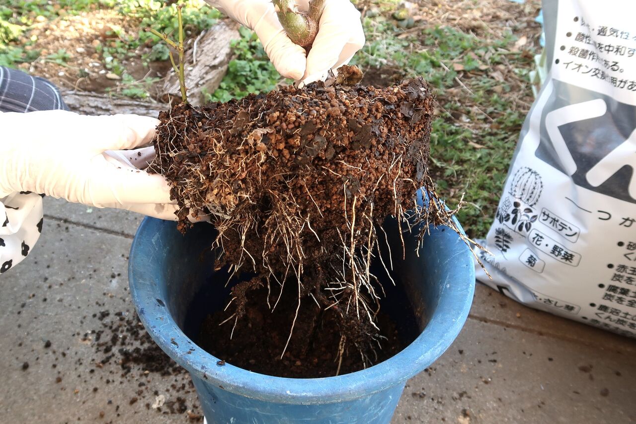 冬は通常の植え替えのようにしますが、やはり根を食べられていたら地上部の枝を減らして一回り小さい鉢に植えておき 、夏成長したら大きな鉢に戻します。