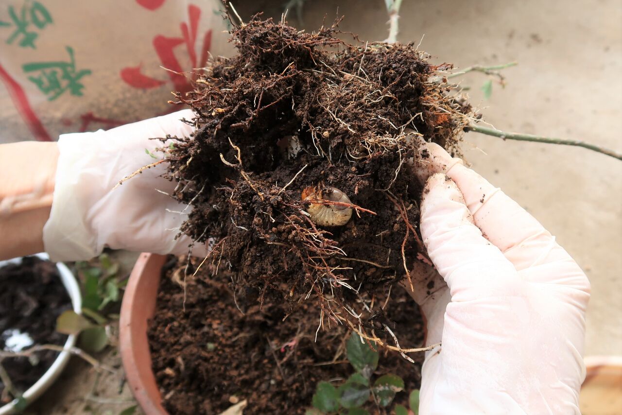 夏・・・新しく植え替える土を用意してから、根を傷つけないようそっと抜いて丁寧に根の間まで見て幼虫を出します。