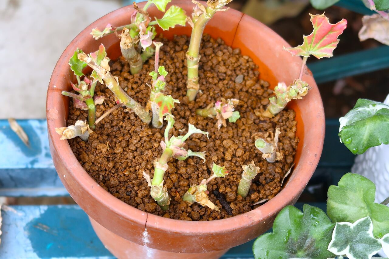 ゼラニュウ、挿し木をして更新します。 今年はセダムも被害に遭いました。セダムも同じようにするといいと思います。