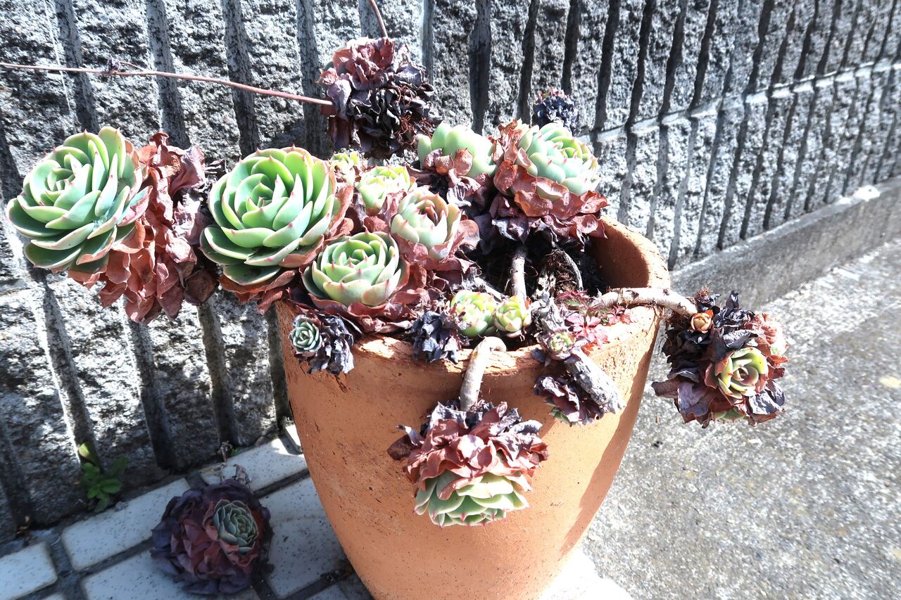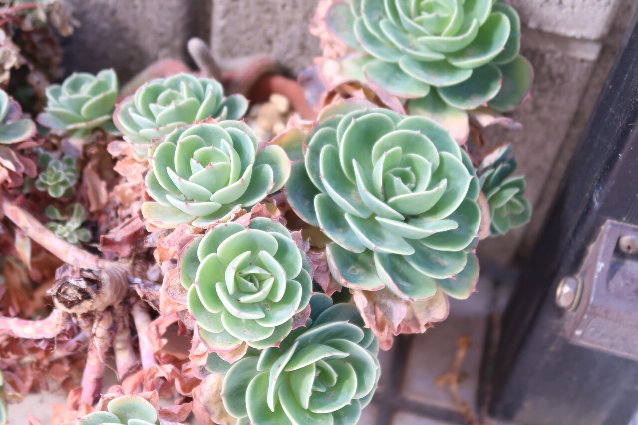 冬はコロンとした感じ、夏はシュッとしたサニーレタスみたいな感じになるのがエケベリアです。さすがの「七福神」お疲れのご様子。頑張ってさし木をいたします。