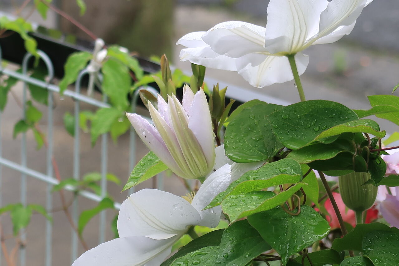 クレマチスたくさん咲いています。細いツルで華奢に見えますが花もちいいです。
