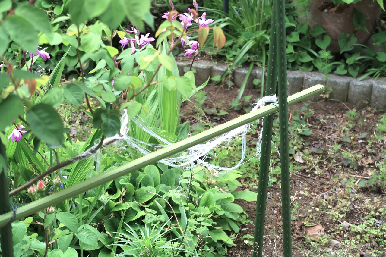 バラの支柱に絡まったこんな荷作りテープも採取しようとしていました。