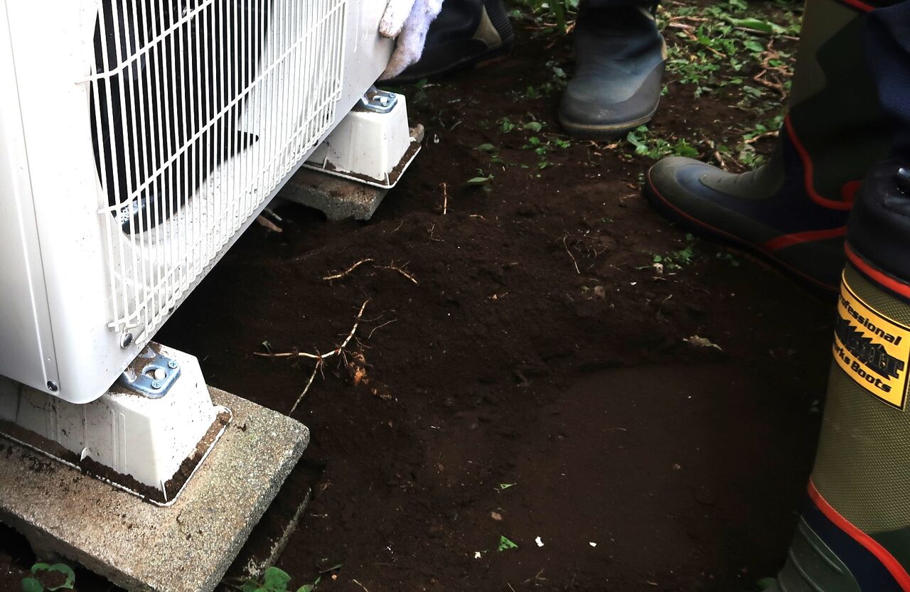 息子が仕事の効率を上げるため自室にエアコンを設置しましたが、室外機がふかふかの土にそのまま置かれていたために傾いています。雨が降ると室外機が泥んこになります。