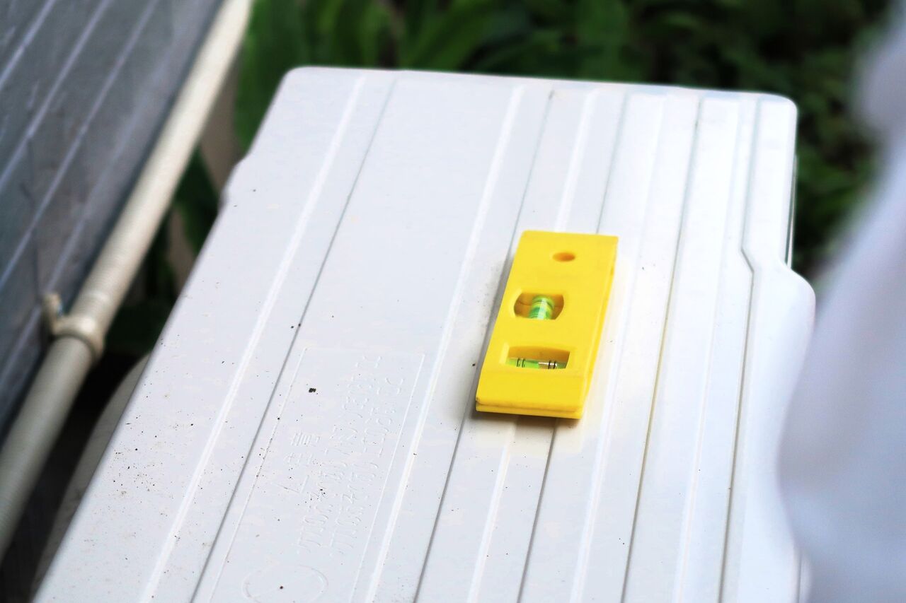 後ろ側に傾いている室外機。
