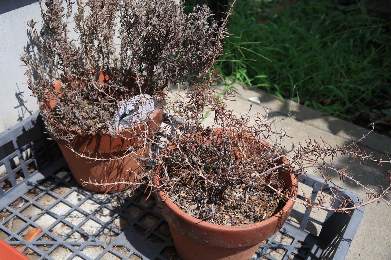 やがて植物たちは元気がなくなり、ついには大きく育ったフレンチラベンダーの親株も、挿し木した株も、ローズマリーも、草花用培養土に植えたものは全部枯れてしまいました。