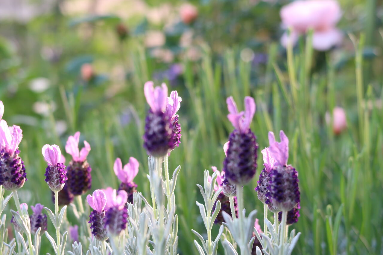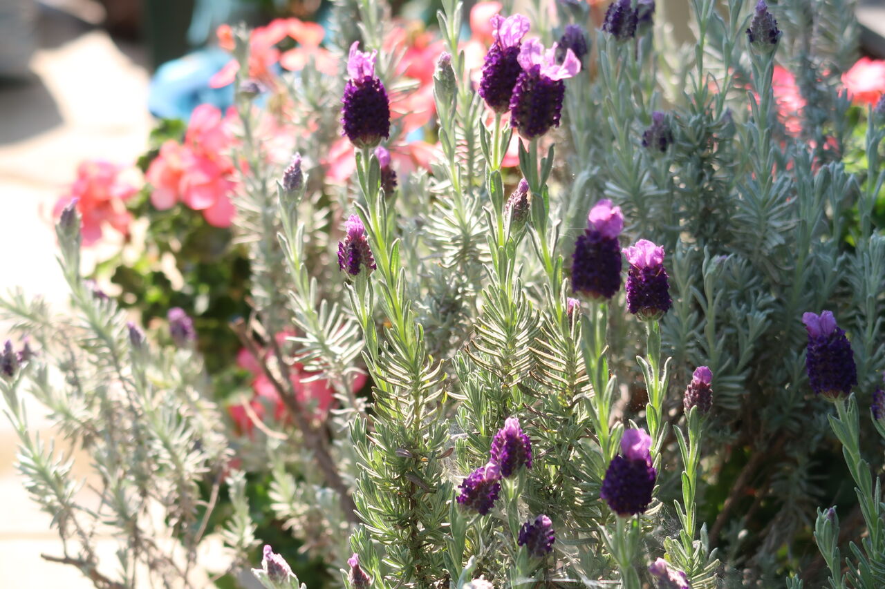 ▲草花用培養土に植えたフレンチラベンダー。枝の発生が少なく、花芽も少なく、花そのものも小ぶりで、ピンクの苞葉が短く小さくなってしまいました。