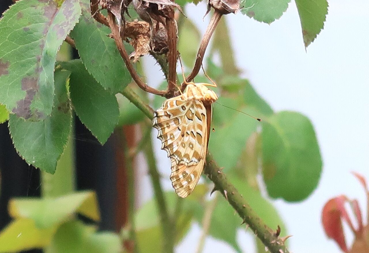 バラにとまったまま次の日の冷たい雨の中丸一日動かないと思ったら、その次の日はいなくなっていました。羽に傷もないきれいな状態でしたので、羽化したばかりだと思うのですが、急に寒くなってちょっと戸惑ったのかしら???