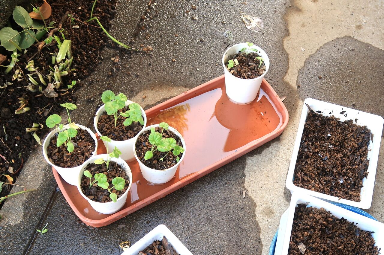 ゼラニウムの鉢植えをいたしました。3月20日に種まきをし、5月8日に紙コップに苗を移植して、虫の被害に遭わないように室内で管理しました。