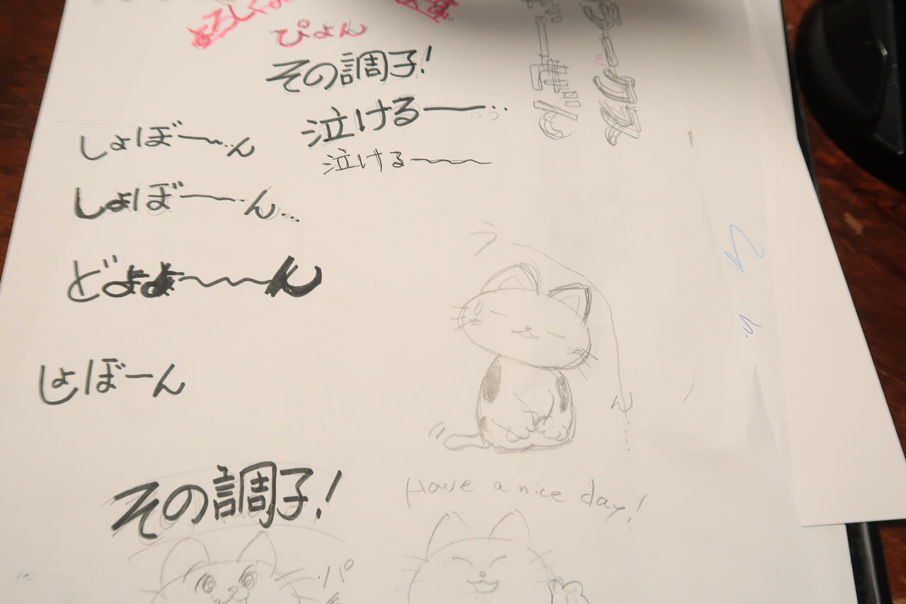 といいうわけで、LINEスタンプを描いています。アプリでも切り抜きや文字を入れることができるみたいですが、私はとてもへたっぴで、膨大な時間が必要になるかもしれません。そこで、私が手描きしたラストを、息子がパソコンに取り込んで切り取ってくれました。それを私がアプリに貼っていきました。