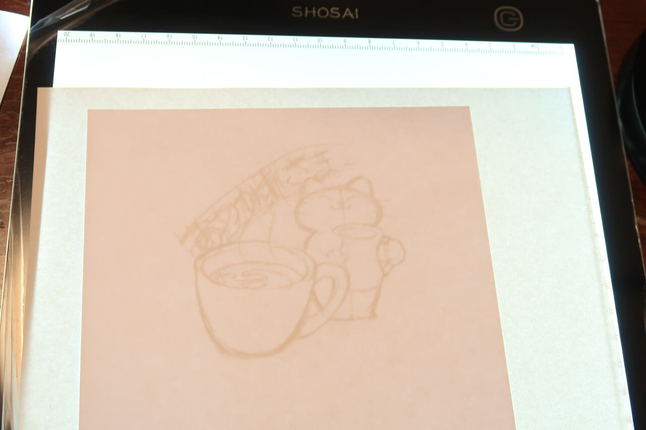 トレース台はめちゃめちゃ便利です。ここまで便利だとは思いませんでした。今は日が暮れても描けます。色鉛筆をポケットに入れて、あげたままの腕が筋肉痛になりながら描く必要もありません。