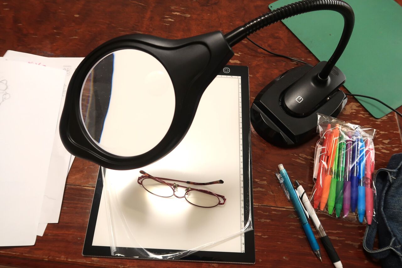 自立のルーペは両手が使えて便利。でも夢中になって自分の息で曇って見えなくなります。その時は休憩を入れるようにして、休み休みやっています。