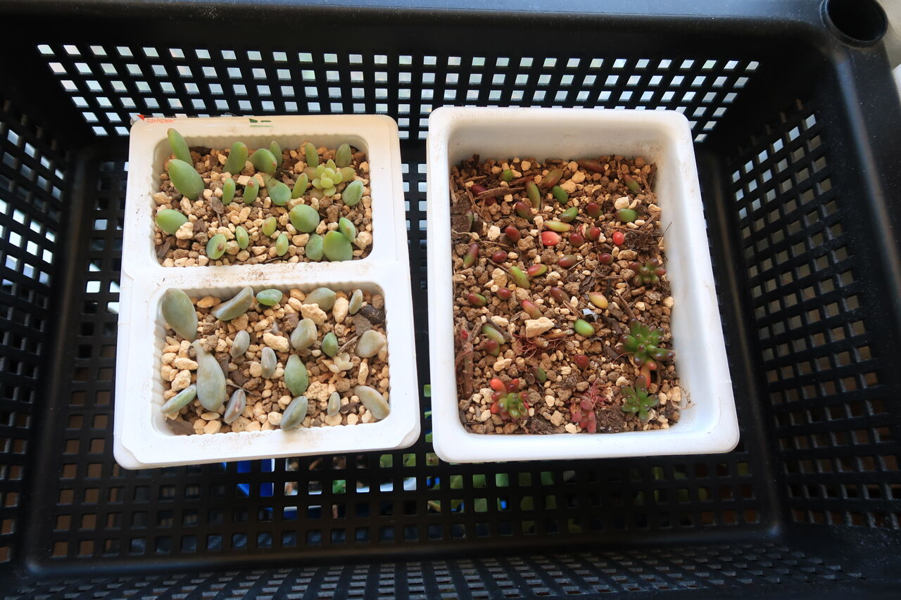 グリーンネックレスとルビーネックレスのさし木も紙コップに移し替えました。この2ポットは根っこがあるのですぐに水をやりました。