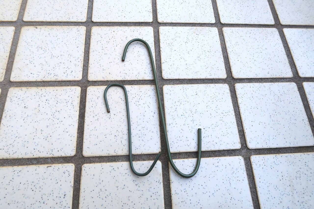 欄の花の支柱などで作ったS字のフック。ツルバラなど手前に手繰り寄せてひもで結びたいとき、固定するものがあると便利です。長さの違う2種類用意するとさらに便利。