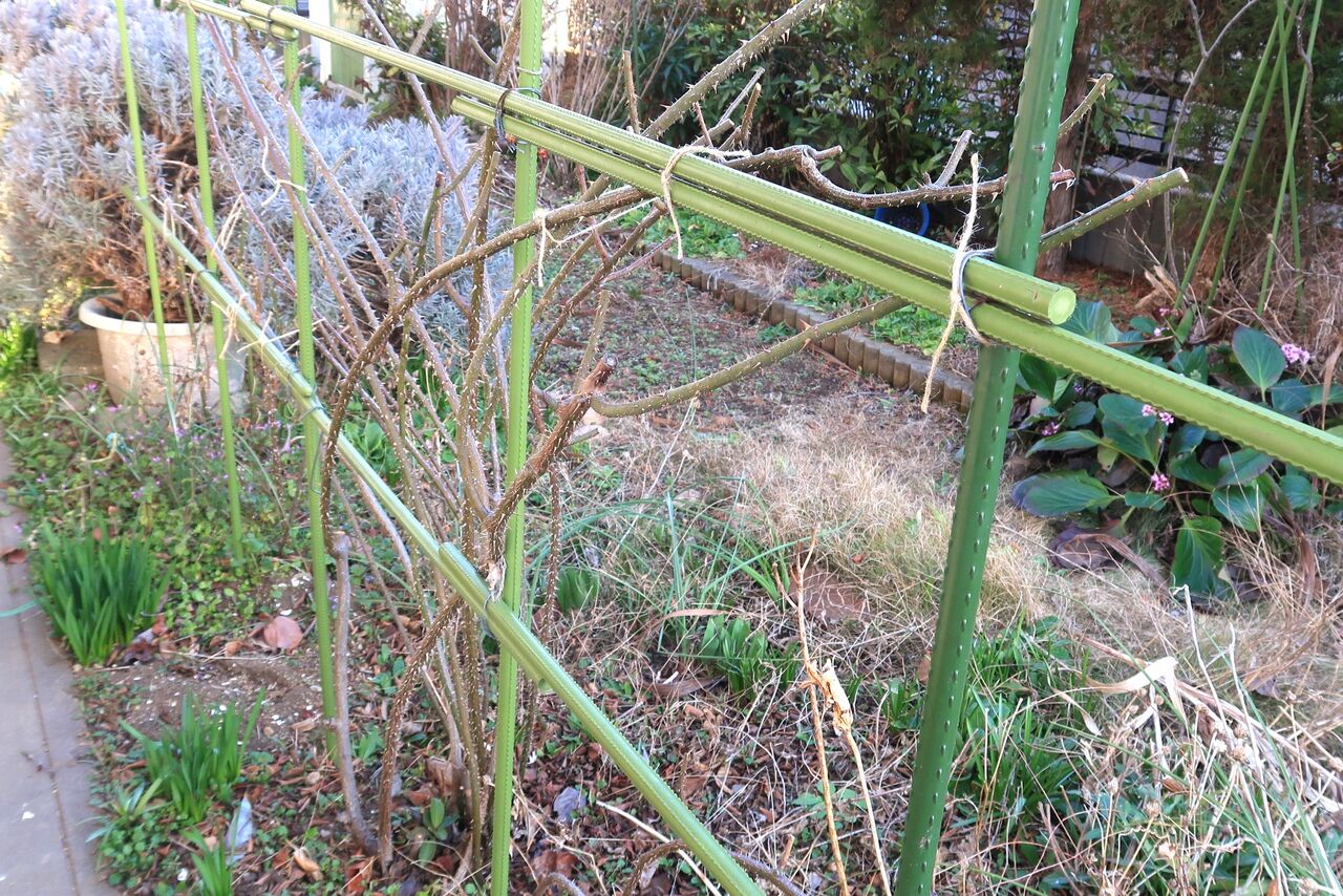 こんな風にひっかけておいて紐で結びます。トゲの多いバラには特に重宝します。