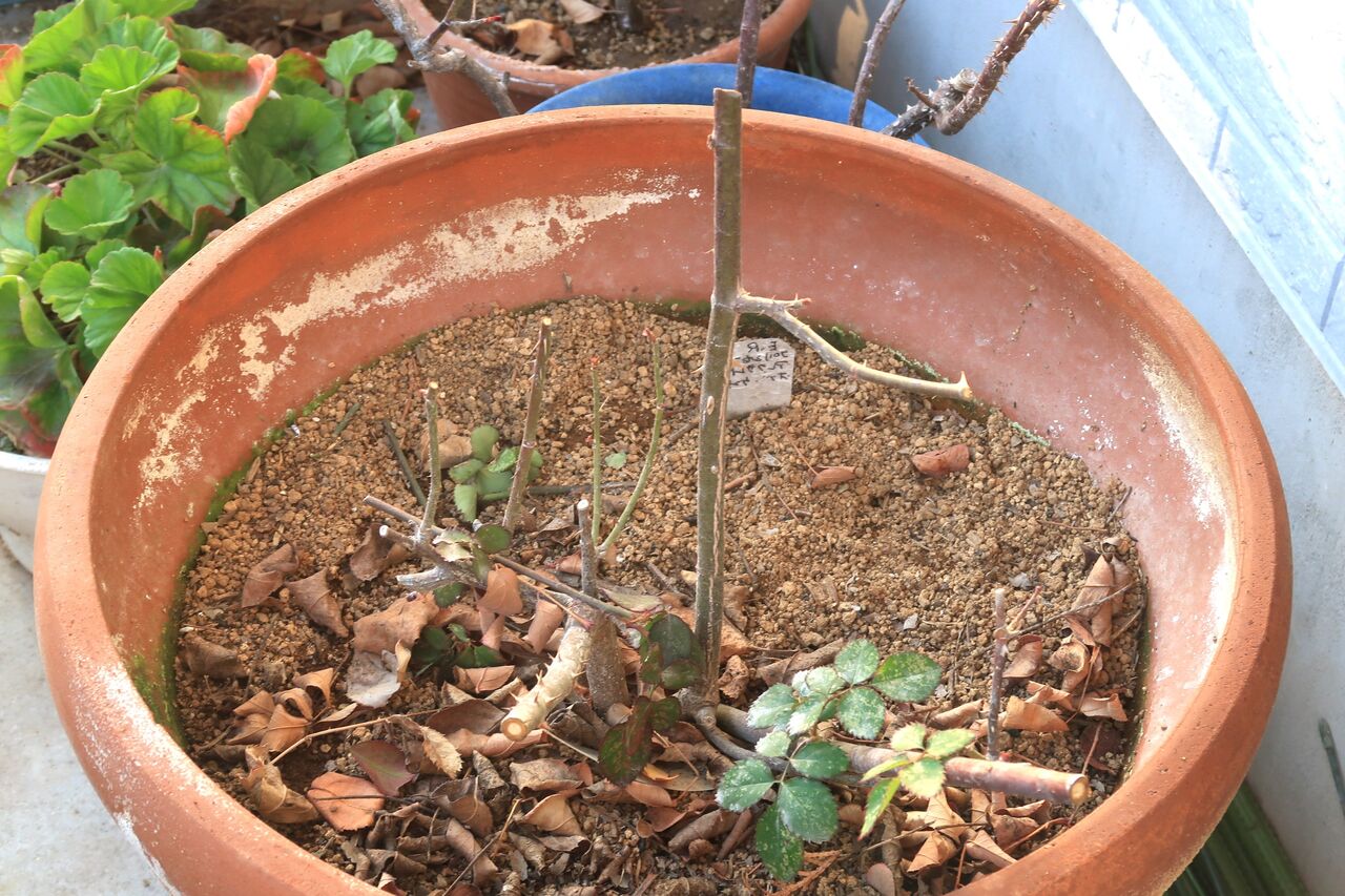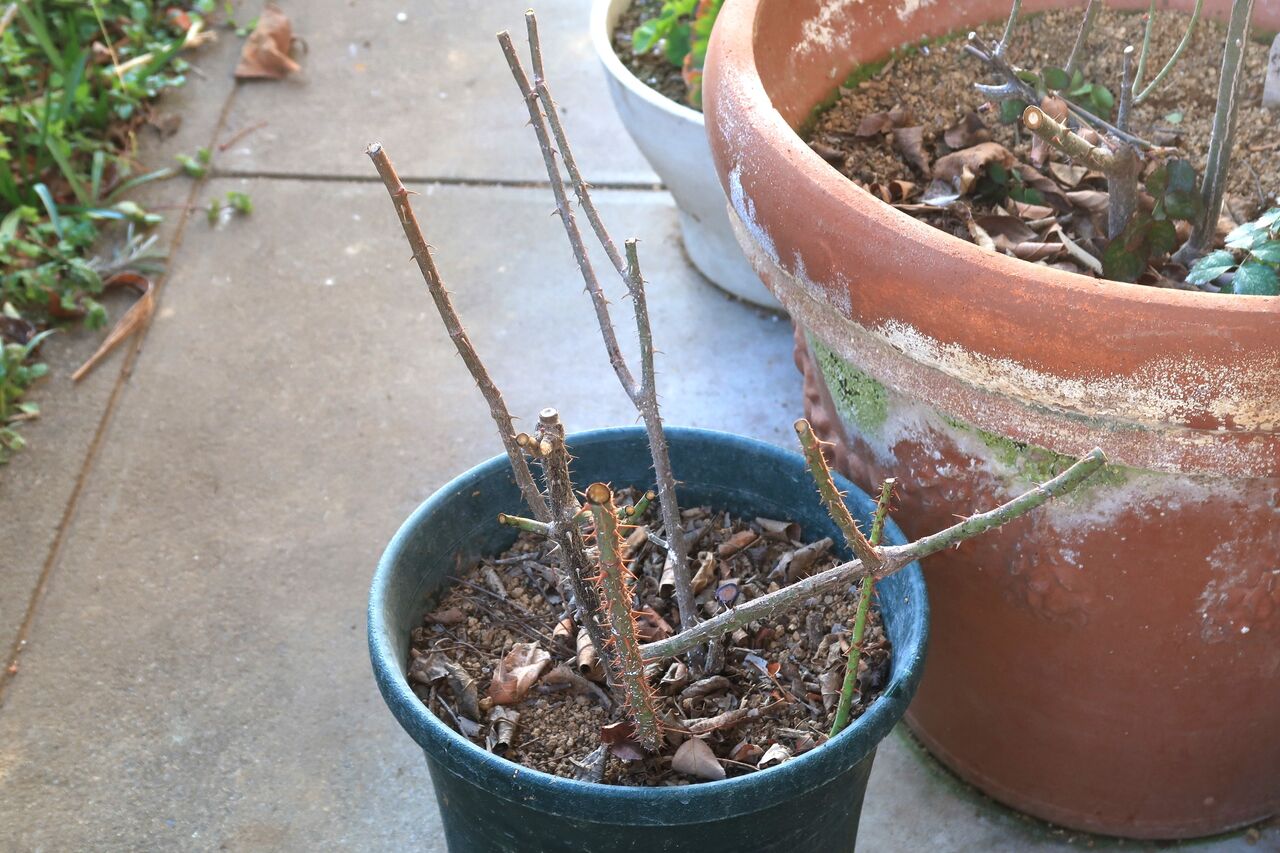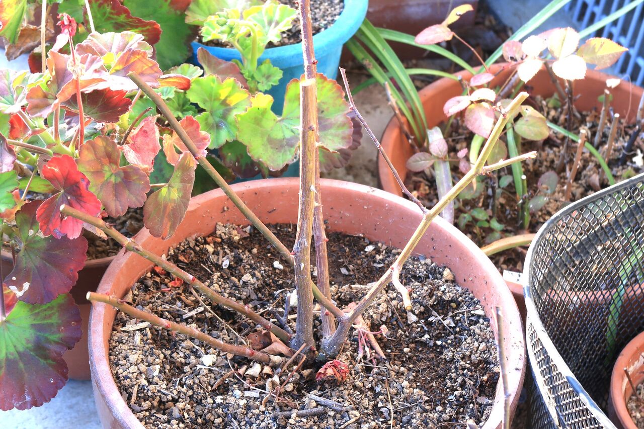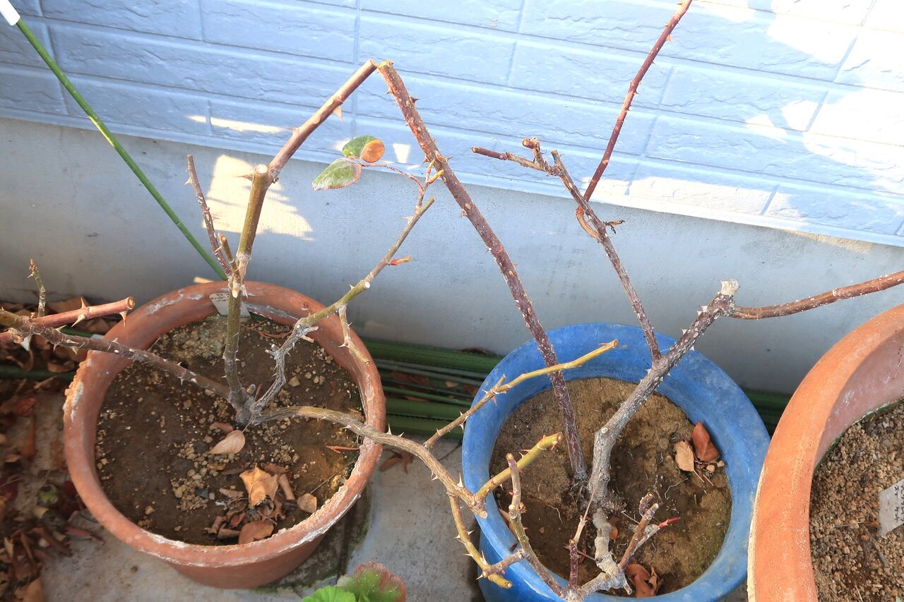 害虫の駆除は、枝がスッキリと見えている時がチャンス。特にイラガのサナギは株の根元から枝先、支柱のいたるところにあります。点検して取り除くと夏イラガに悩まされずに済みます。