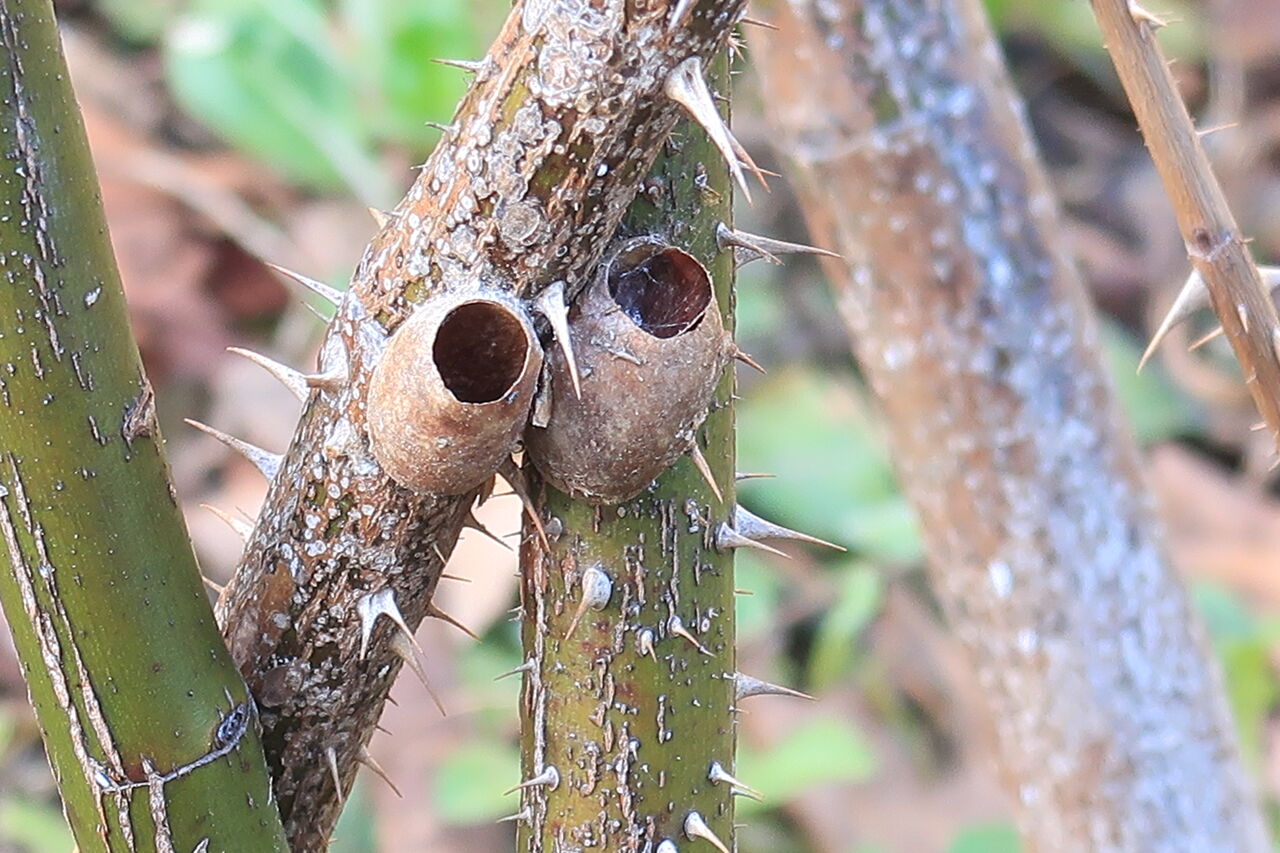 イラガのサナギカプセル、蓋が開いているのは羽化した後です。こういうのも取り除きます。手袋をして作業します。