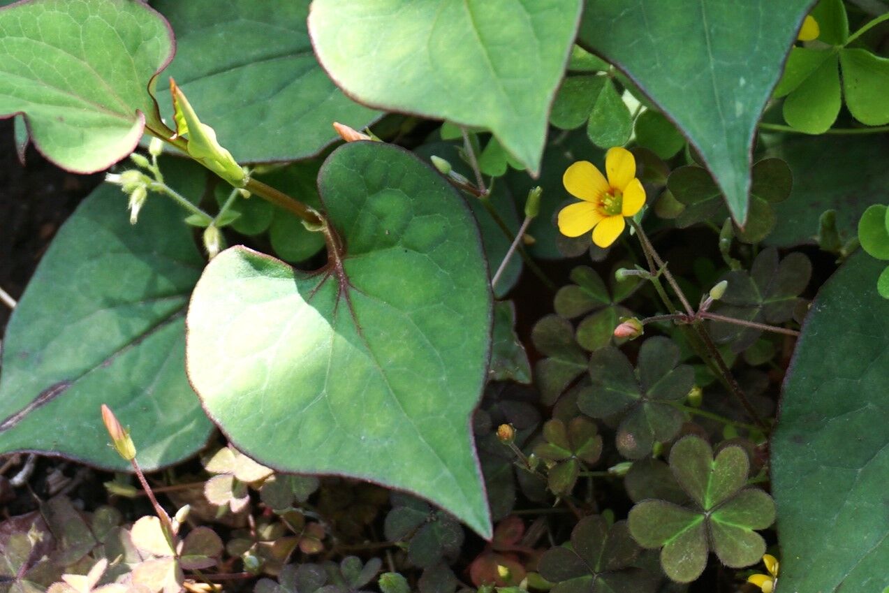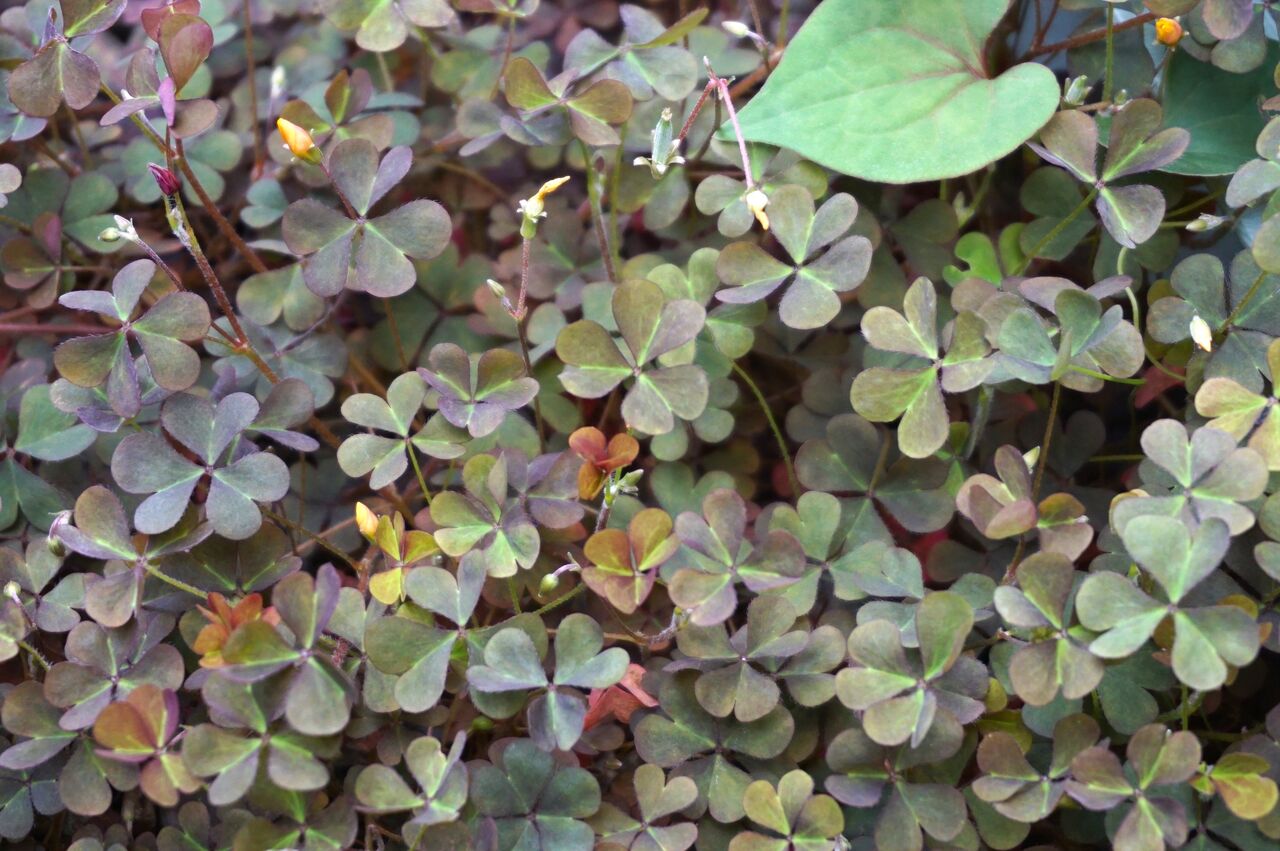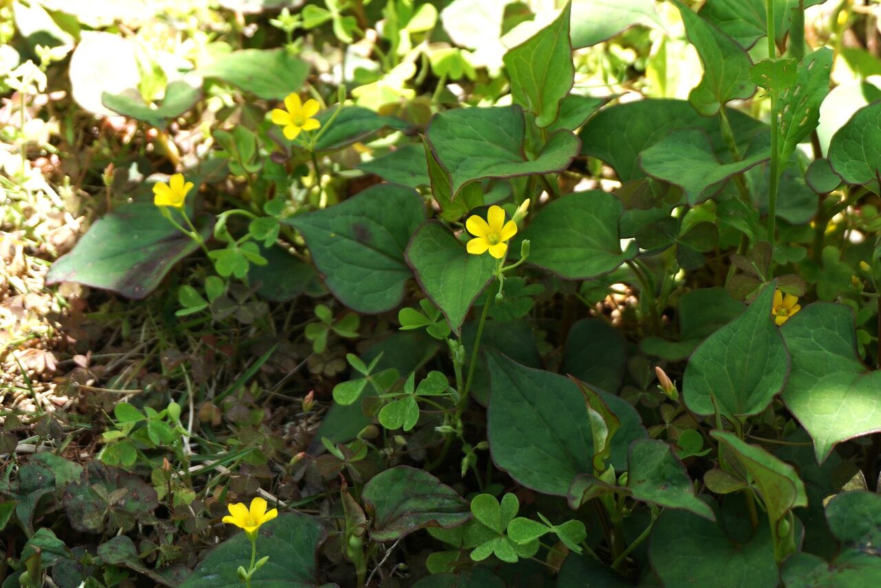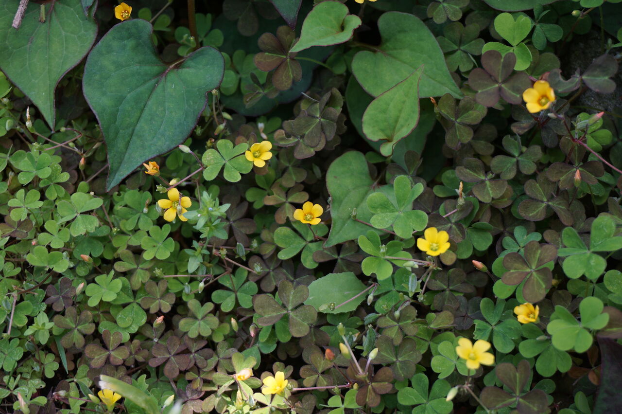 緑色の葉をもつ花と赤い葉を持つ花とでは、同じ場所に咲いていても違います。赤い葉のカタバミは花の色も濃いオレンジに近い黄色です。