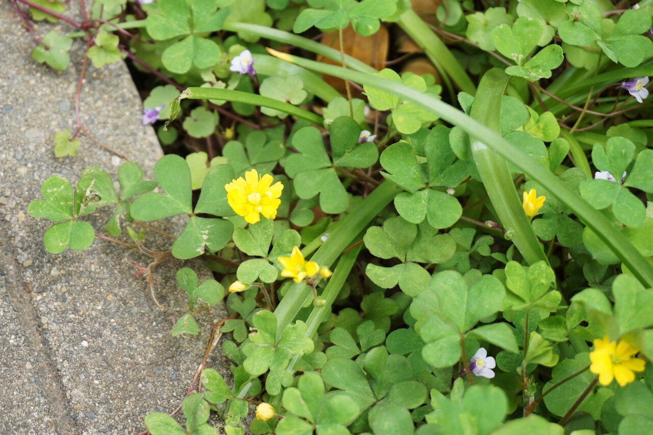 カタバミの八重を発見しました。よく歩く硬い土のところ。日当たりはまあまあで、肥料はない。