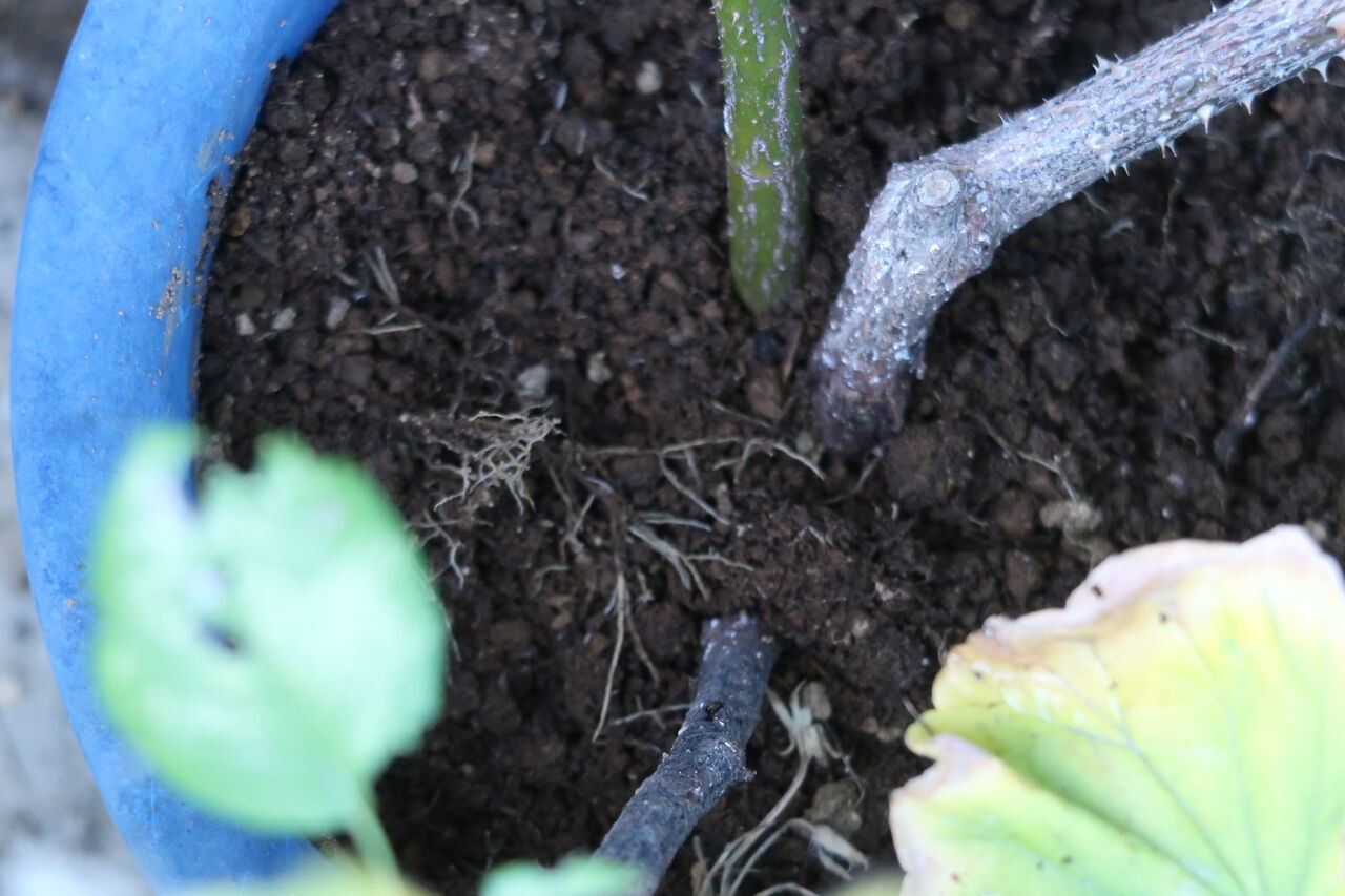 青い鉢か根はしっかりと表面まで覆い、大丈夫なように見えましたが、新芽が出ないので鉢の中を点検する必要があります。