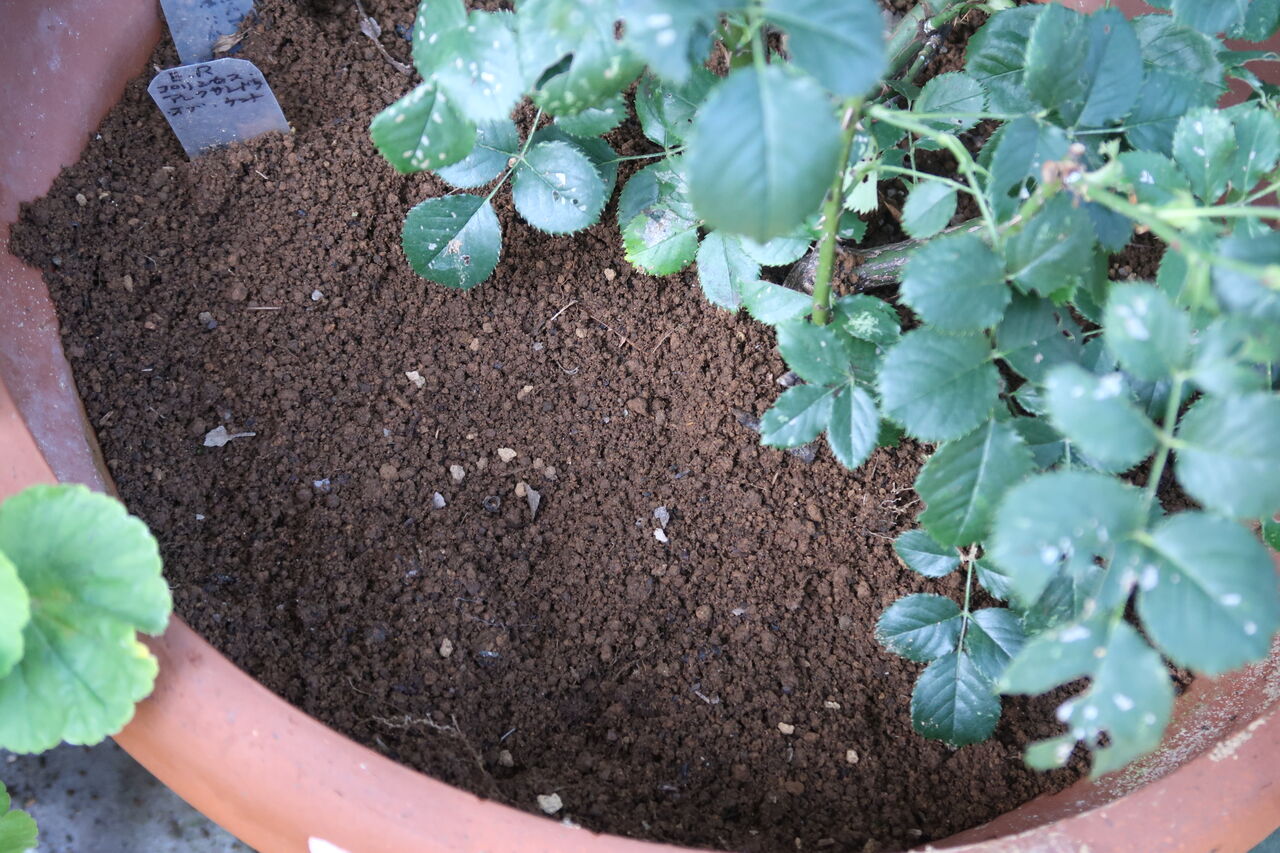 このバラの土は粒状の塊の土。バラを植え付けたときとは違う形です。