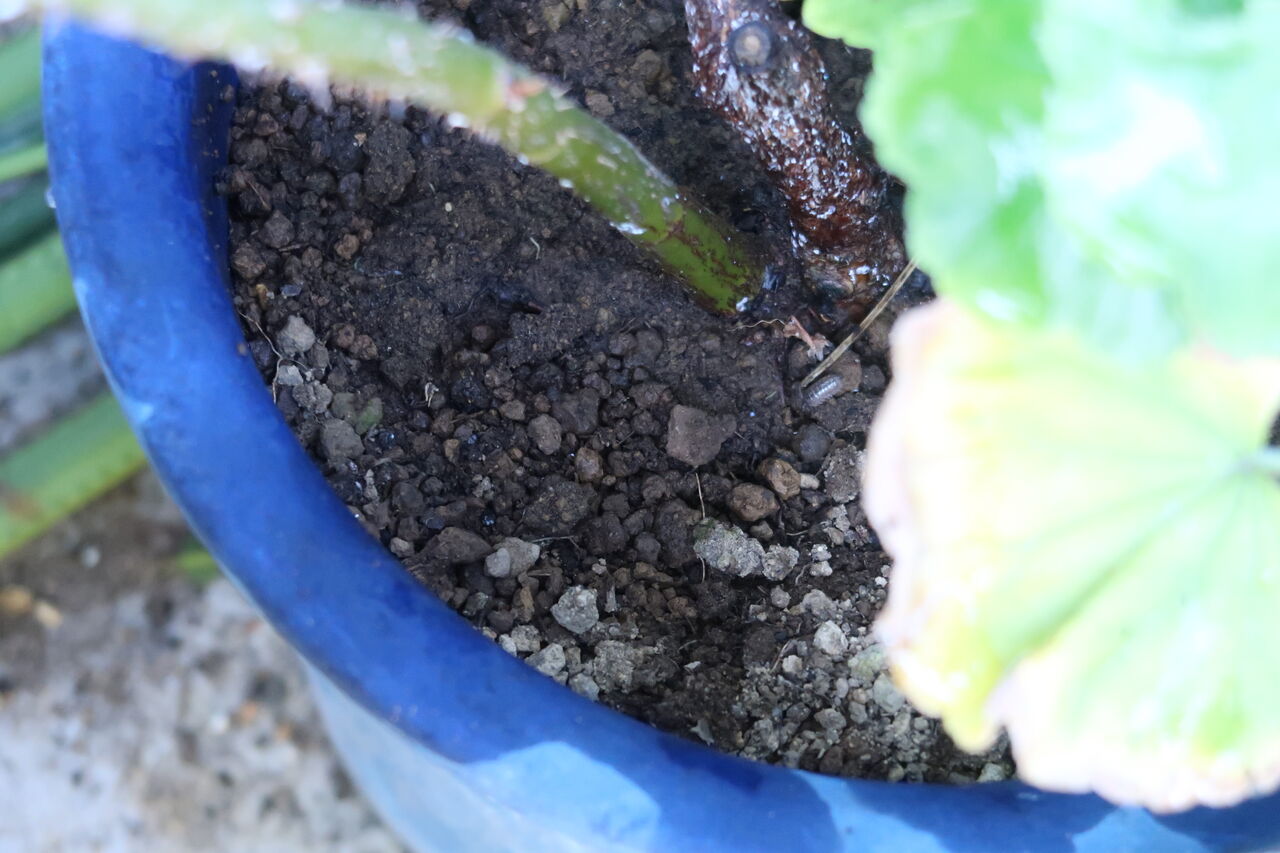 鉢が元気がないのはすべてコガネムシの幼虫だと思っていましたが、ミミズが入り込むこともあるんですね。