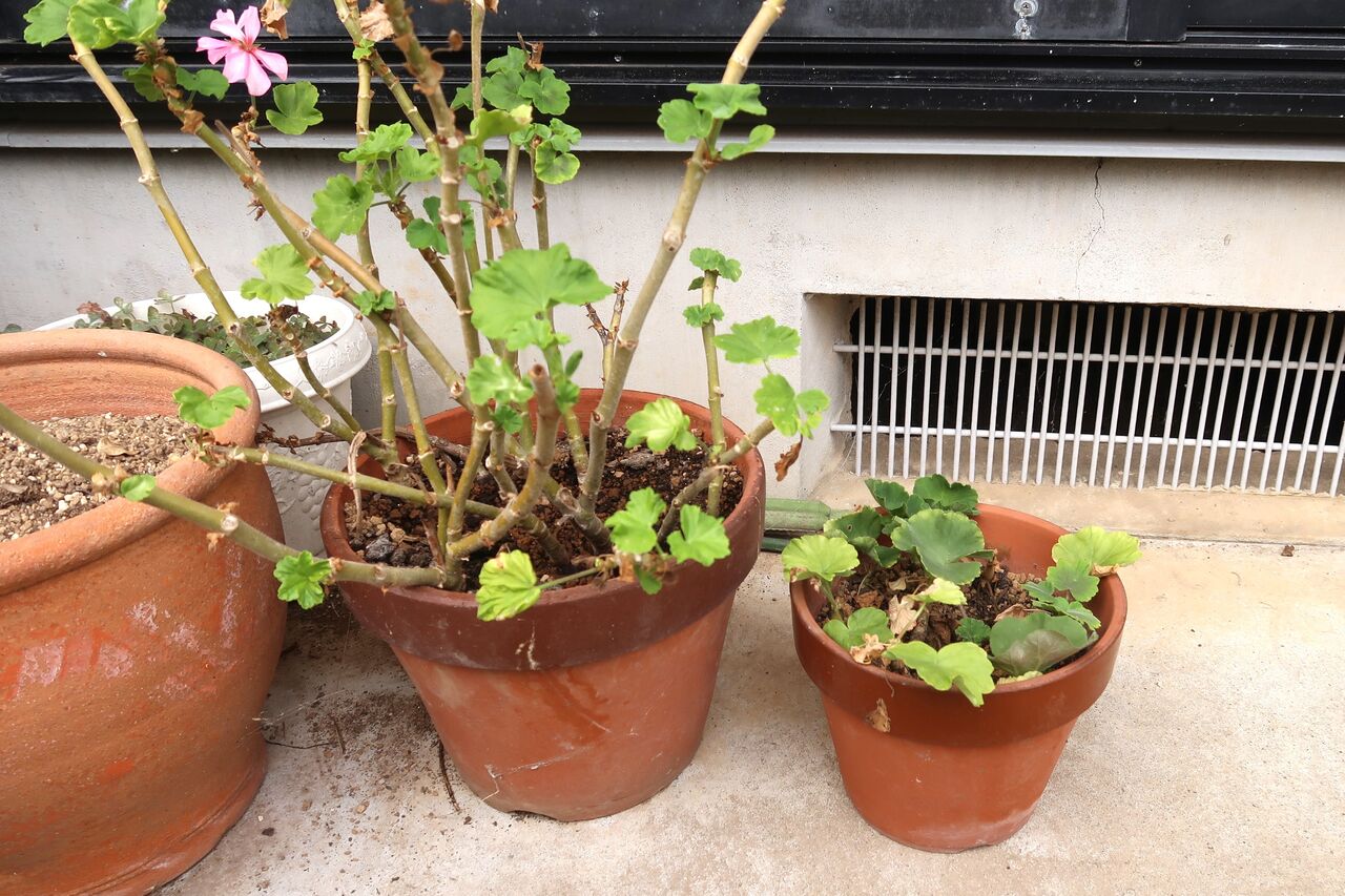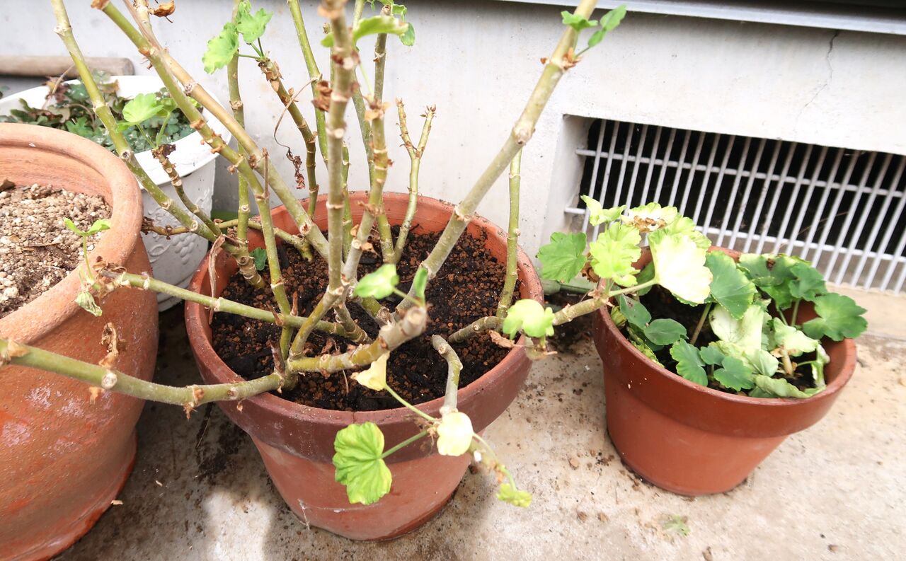 ゼラニウムは、夏気温が高くなると葉の色が白っぽくなってしまいます。今年の夏は暑すぎたので、日陰に移動しておきました。
