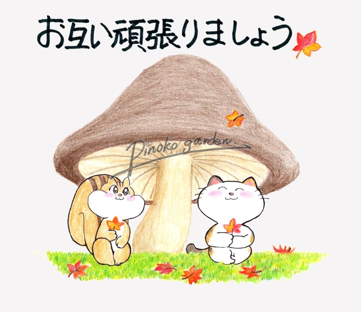 こちらが表紙のイラストです。秋を感じるスタンプということで、きのこやどんぐり紅葉などを配し、秋らしくしあげました。