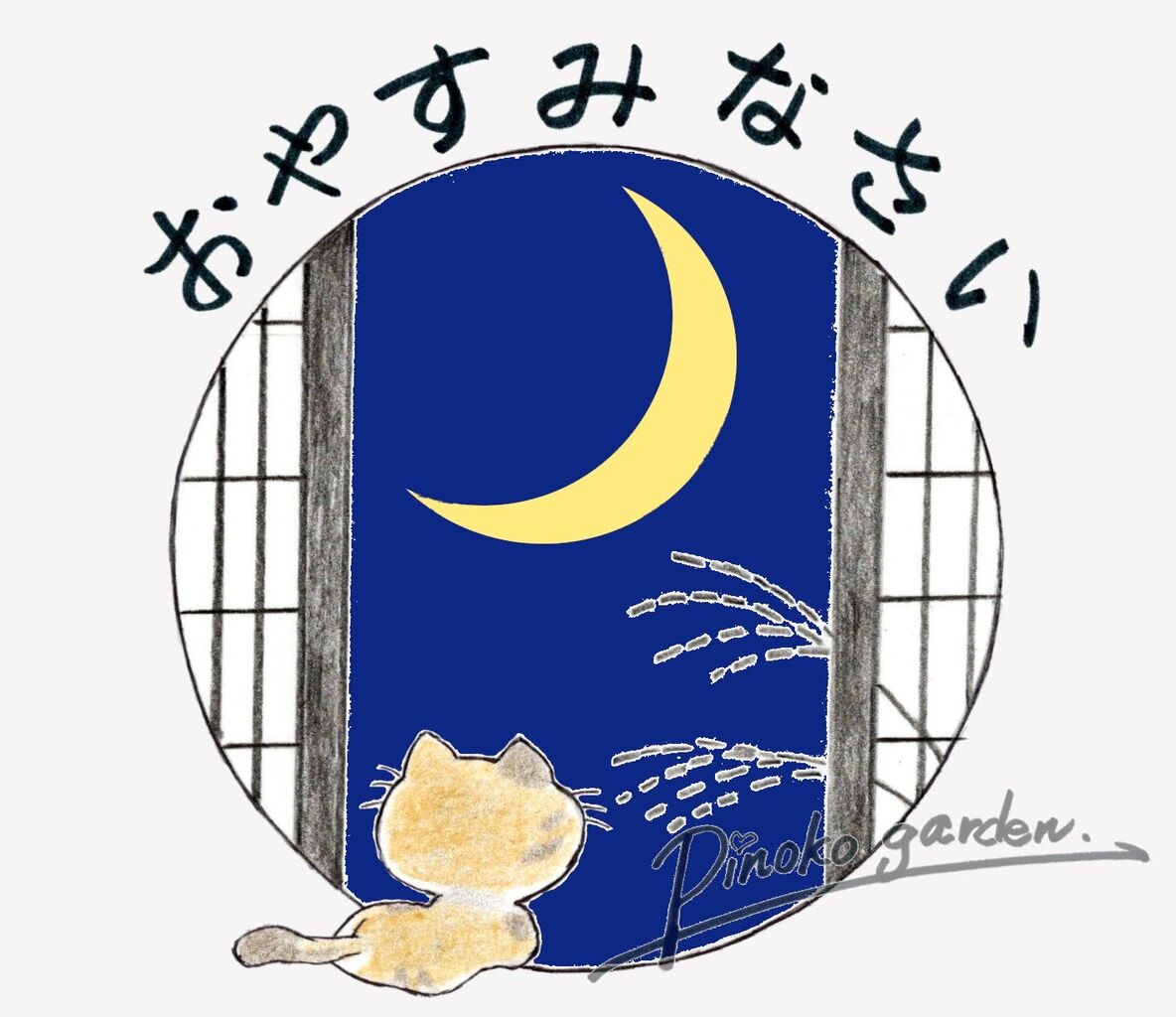 この円、コンパスで円を下絵に描いた後でボールペンで少しずつ描きました。月と夜空はパソコンで色つけです。あっという間に綺麗な色の月夜ができました。デジタル凄し!!
