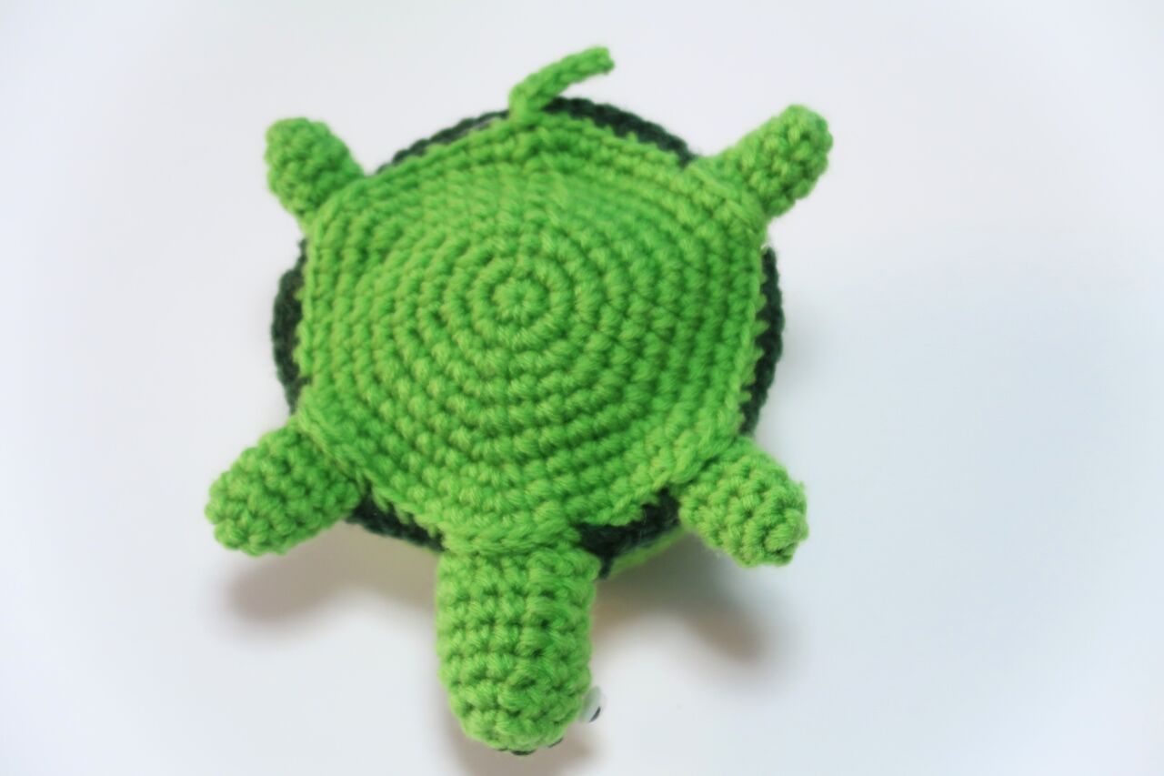 頭・手足がついたら、甲羅をつけます。休めておいた濃い緑で編んでいきます。