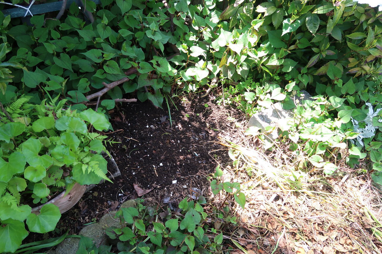 アーチの下も。ここだけでかなりのドクダミの葉と、葉よりたくさんの根っこでした。