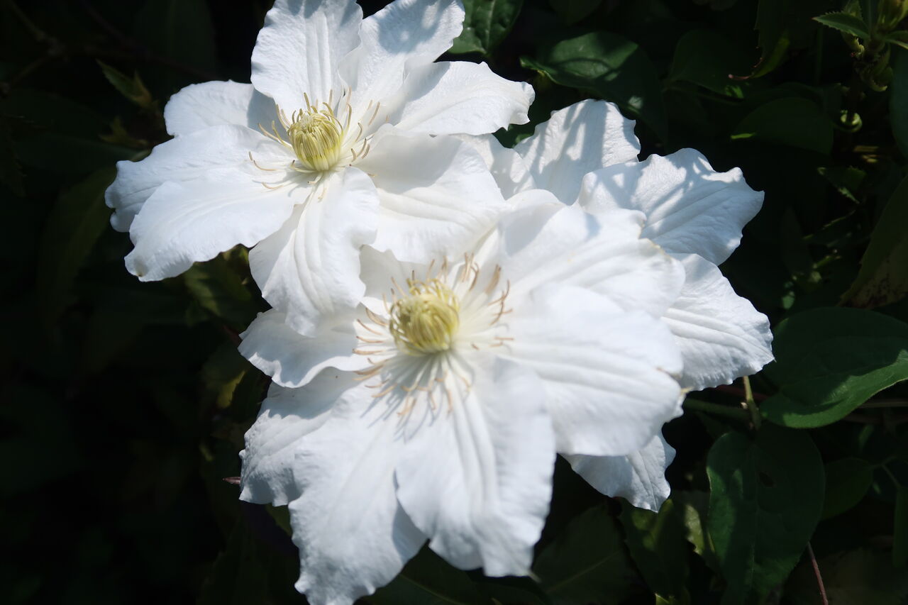 こぼれ種で芽を出したクレマチス「白雪姫」。本家より花が小さくて、気持ち花びらの縁が波打っています。