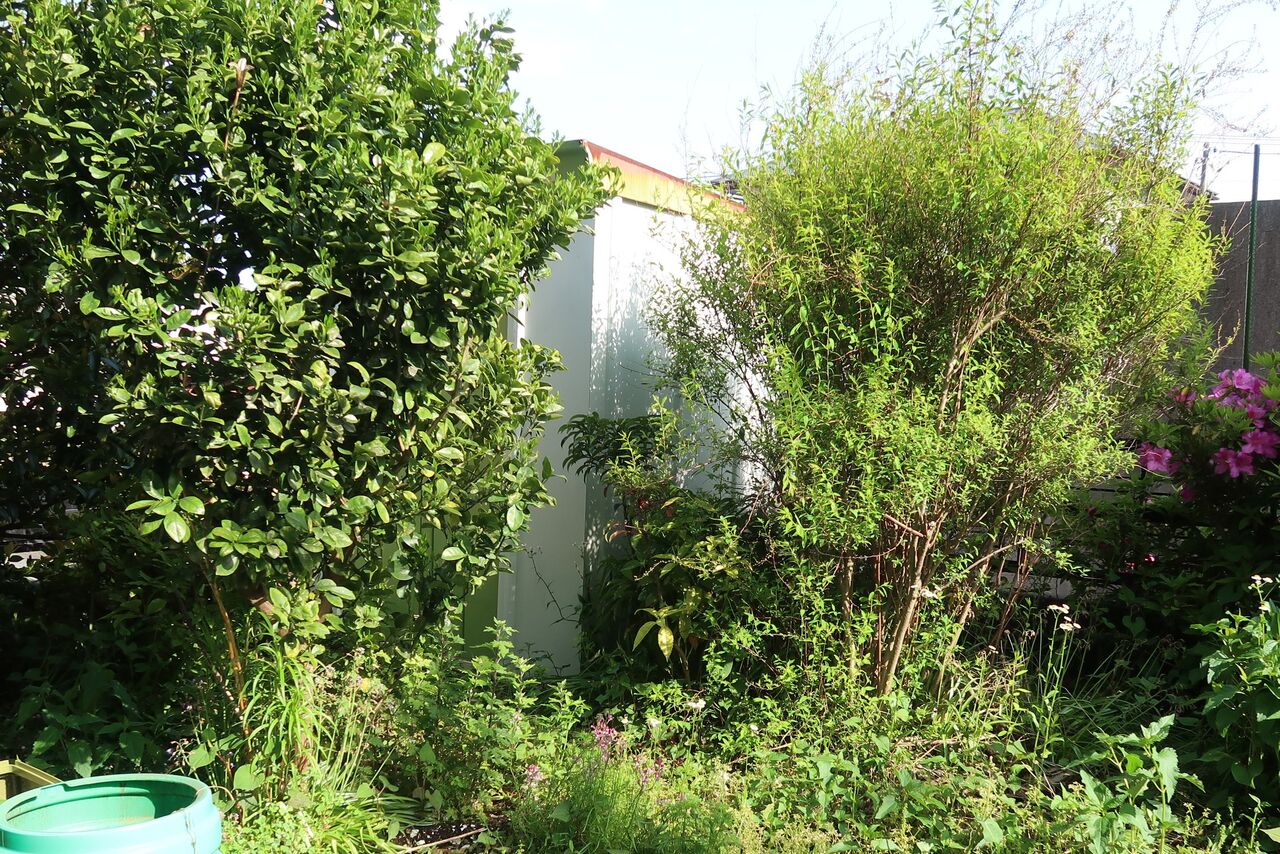 これは2020年の写真です。大体5年でこの大きさになっています。いつも通るときの邪魔にならないように葉を落とすぐらいはしていました。雨どいに当たるようになったので切りました。