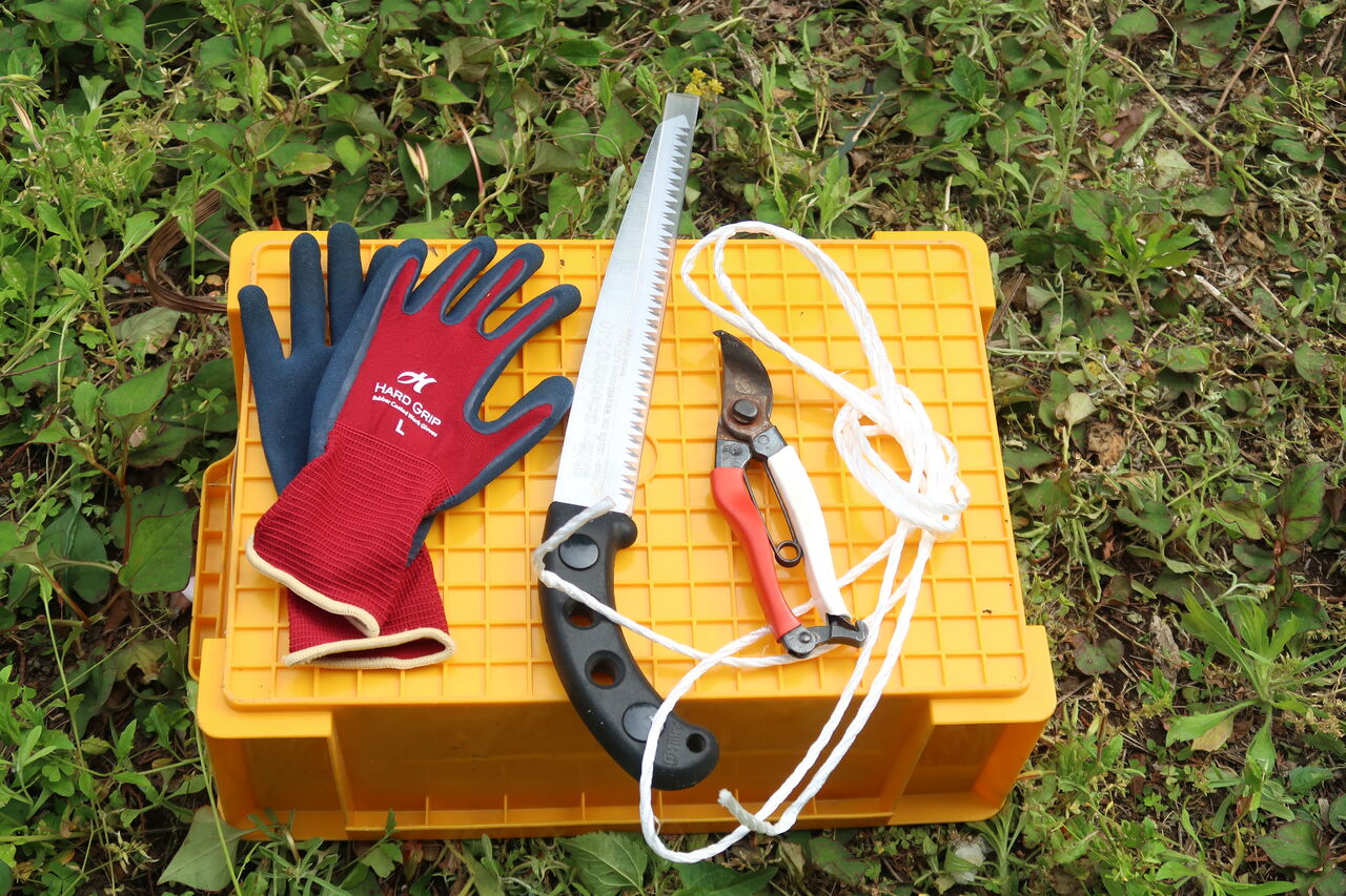 手袋・ノコギリ・剪定バサミ・枝を縛るPPロープ・ゴミ袋