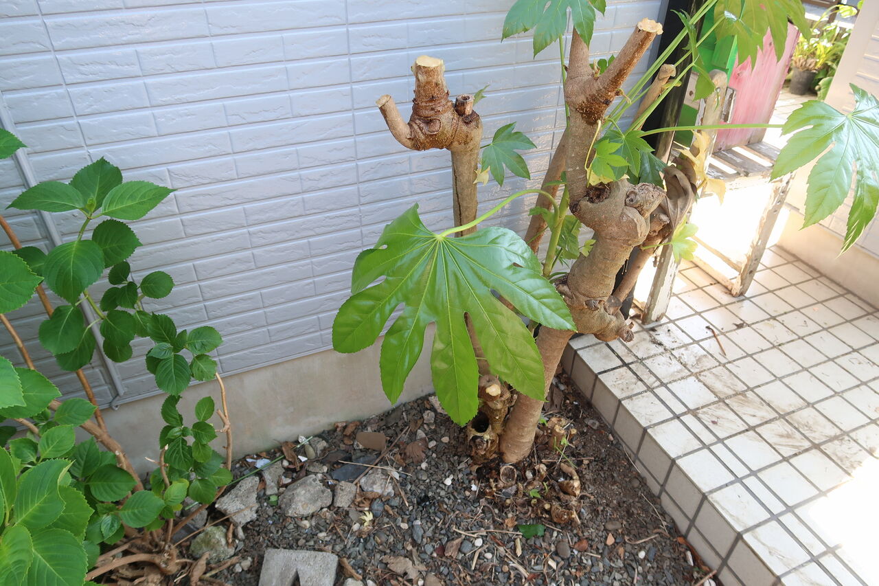 ヤツデはいつも通り大きくなたっら1メートルくらいに小さくしています。