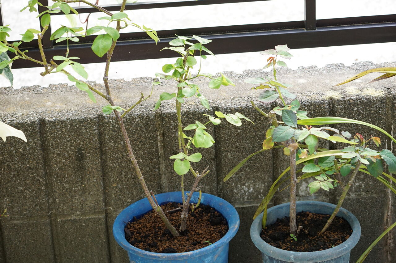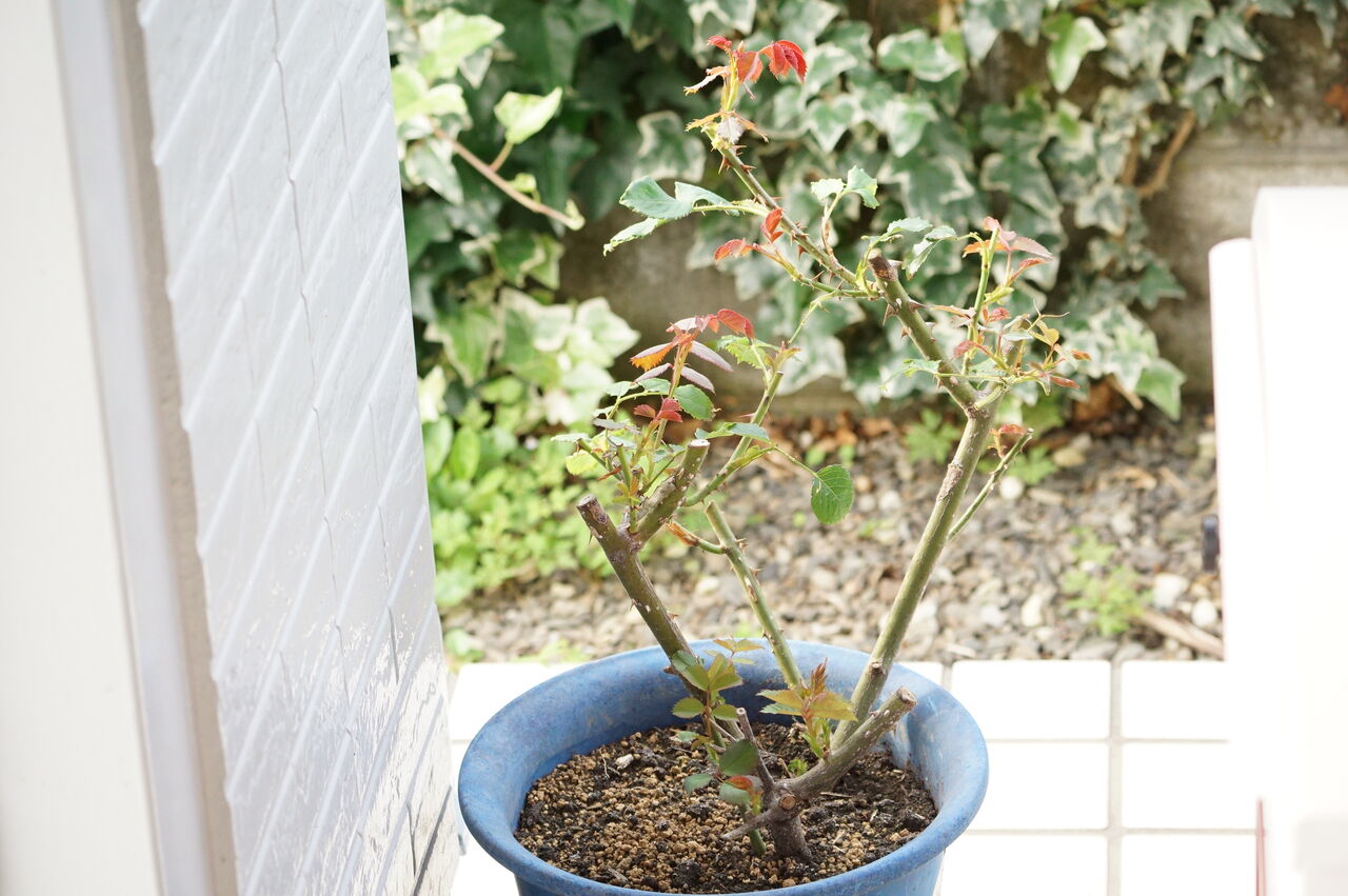 生き残りのためだけに植え替えたバラ、元気に新芽を出しました。バラって本当に丈夫な生き物ですね。丈夫なものしか生き残れない庭ではありますが。この新芽を見ると元気が出ます。